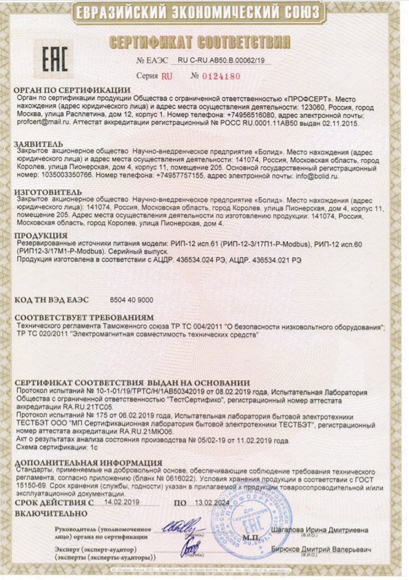 РИП-24 (исп.50) используется для работы в составе ИСО "Орион" для питания извещателей, приборов ОПС, СКУД и пожарной автоматики. РИП рассчитан на непрерывный круглосуточный режим работы с заданными выходными параметрами, с автоматическим контролем и зарядом герметичных аккумуляторных батарей. Особенности прибора: передача событий на пульт "С2000М" или АРМ "Орион Про"; измерение и передача данных по запросу от "С2000М" или АРМ "Орион Про"; расширенный диапазон входного напряжения сети, металлический корпус и т.д. РИП обеспечивает световую индикацию; звуковую сигнализацию; датчик вскрытия корпуса; защиту от перенапряжения, от КЗ, от переполюсовки АБ; интерфейс RS-485