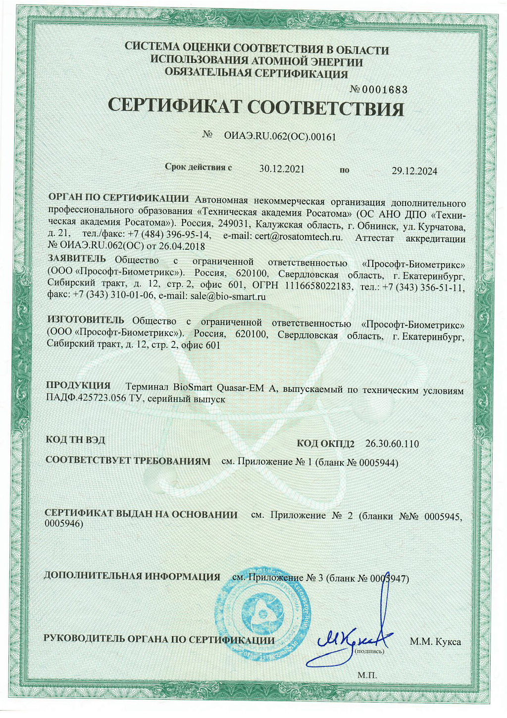 Биометрический терминал с идентификацией по лицу и дополнительным идентификаторам по картам или цифровому коду, QR-коду, цветная камера RGB 5 МП, инфракрасная камера 1 МП, камера глубины, 3D-ИК-проектор с антиспуфингом (защита от фальсификации с помощью фотографии или видео) по облаку точек, 6-ядерный ARM-процессор, flash-накопитель объемом 16 Гб, объем оперативной памяти (RAM) 2 Гб. Сенсорный экран 10,1" (800х1280). Терминал работает в полной темноте или при сильной солнечной засветке. Количество шаблонов лиц 100 000 (1:1), 10 000 (1:N), журнал событий 10 000 000, 100 000 (события+фото), время идентификации менее 1 сек, встроенный считыватель карт формата EM-Marine (EM), опционально Mifare / DESFire, HID iClass, HID Prox (HD); интерфейсы wiegand, RS-485, USB, релейный выход, Wi-fi, Bluetooth, Ethernet. 12 В, 2 А или PoE, IP65, 0...+50 °C, 328х174х36 мм