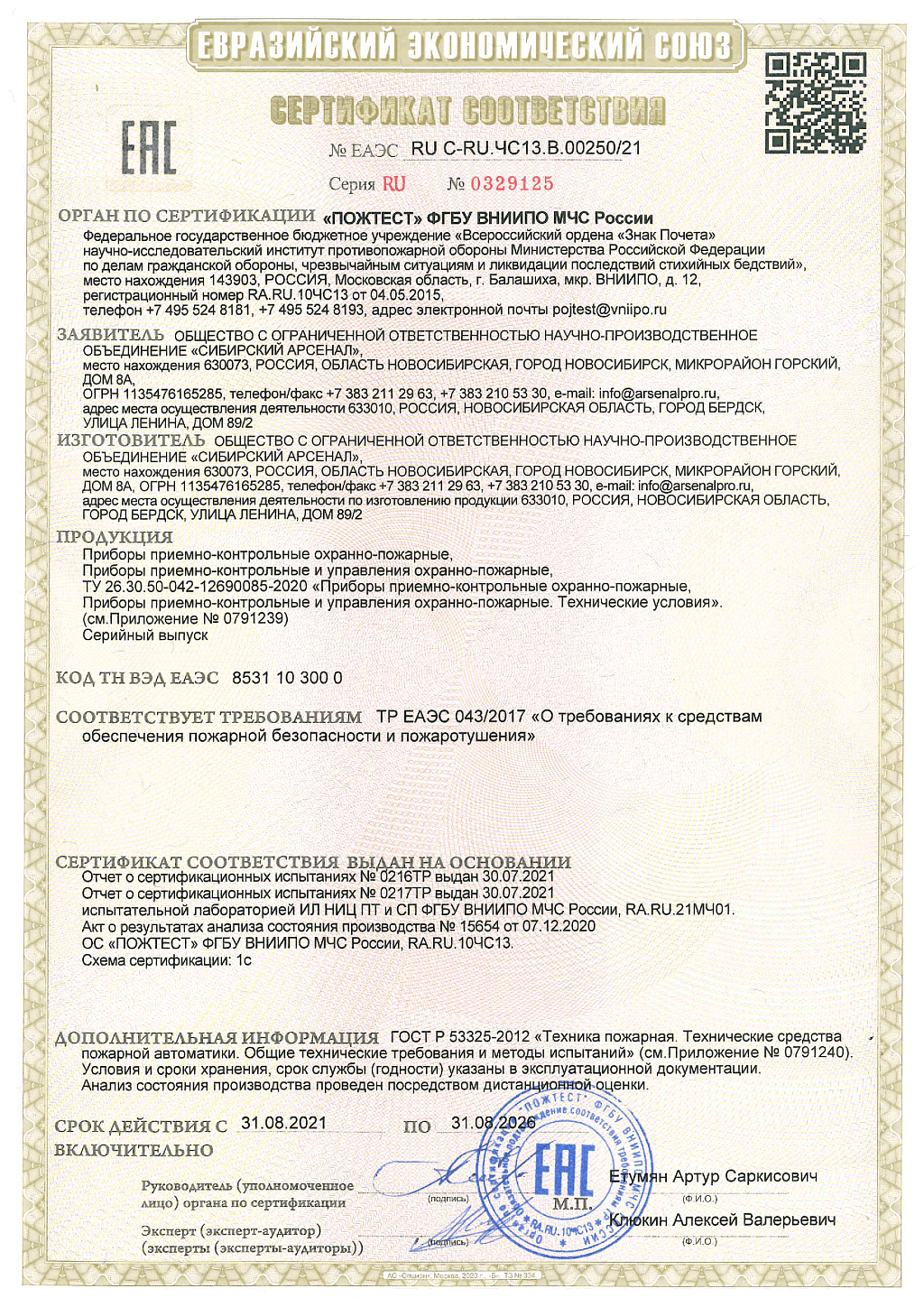 Релейные выходы для подключения светового и звукового оповещателей. Световой оповещатель выключен, когда все ШС сняты с охраны, светится непрерывно после взятия ШС под охрану и мигает при любом нарушении ШС. Звуковой оповещатель выдает непрерывный сигнал при извещениях «Неисправность» и «Тревога» (длительностью до 3 мин) и прерывистые сигналы при извещениях «Внимание» (периодичность 2 с) и «Пожар» (периодичность 1 с).