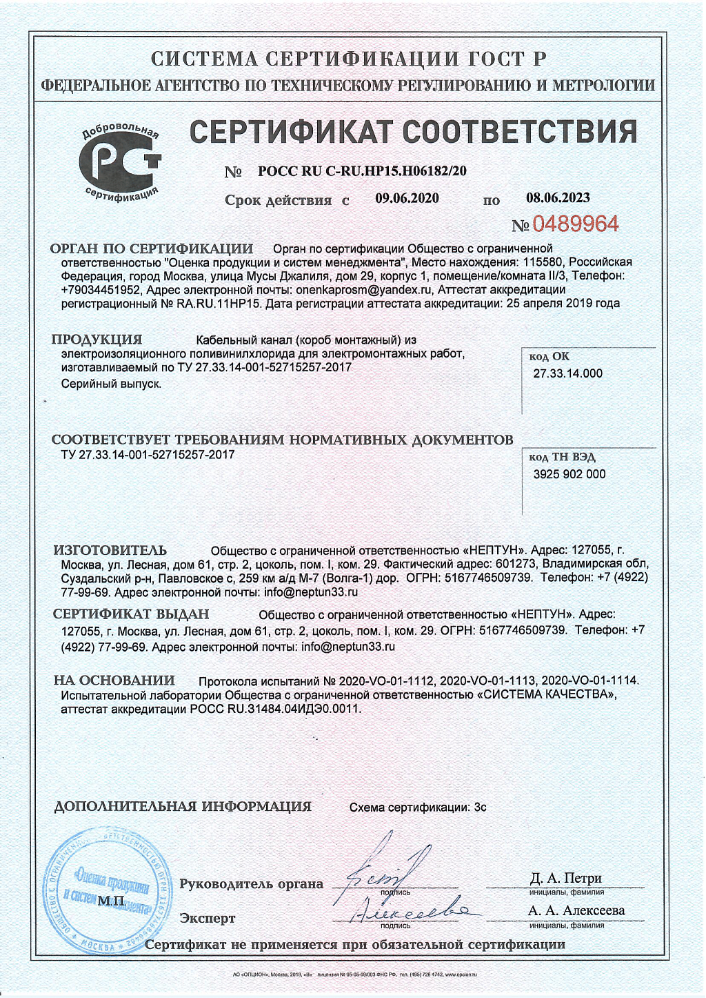 Кабельный канал предназначен для защиты проводов и кабелей от механических повреждений. Материал изготовления - ПВХ пластикат (соответствует требованиям пожарной безопасности по ГОСТ, категория горения ПВ-0) препятствует возгоранию изделия. Двойной замок надежно удерживает крышку и обеспечивает доступ к электропроводке при расширении сети и в аварийных ситуациях, без риска потери эксплуатационных свойств. Рекомендуется сопрягать короба и крышки изделий из одной упаковки или, если кабельный канал не в заводской упаковке, сопрягать короб и крышку из одного комплекта. Кабельный канал имеет высокую коррозионную, химическую стойкость и высокую пластичность.
