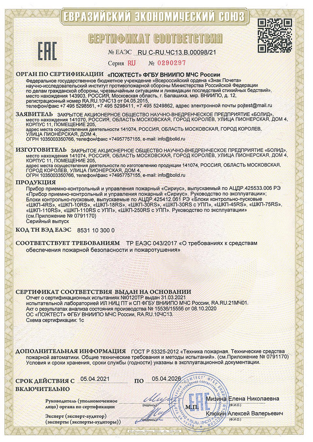 ППКУП "Сириус" используется для контроля и управления системой пожарной сигнализации, оповещения, пожаротушения, дымоудаления и вспомогательным инженерным и технологическим оборудованием участвующим в обеспечении пожарной безопасности. Особенности прибора: - - --Встроенный модуль контроля кольцевой линии ДПЛС "С2000-КДЛ-С" на 127 адресных устройств