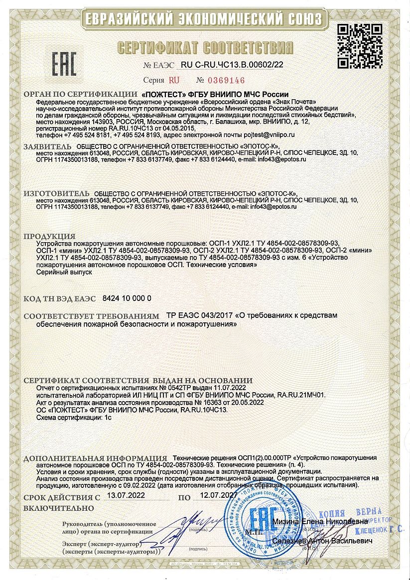 Самосрабатывающие огнетушители ОСП-1 предназначены для тушения пожаров класса А, В, С без участия человека, а также установок под напряжением.