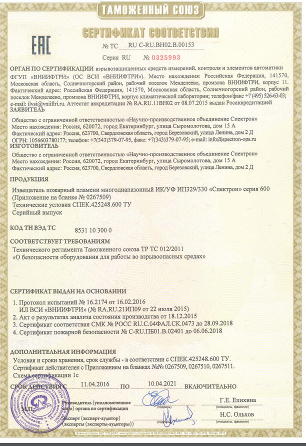 Извещатель пожарный пламени взрывозащищенный РВ ExdI/1ExdIICT5, комбинированный ИК/УФ; угол обзора 100 гр, время срабатывания 3/7/15/22 сек., функция самоконтроля; 2 или 4 -проводное подключение; U-пит.9...28 В, I-потр.250 мкА; IP68, t-раб.-60...+75°С. Корпус из нержавеющей стали. Без кабельных вводов.
