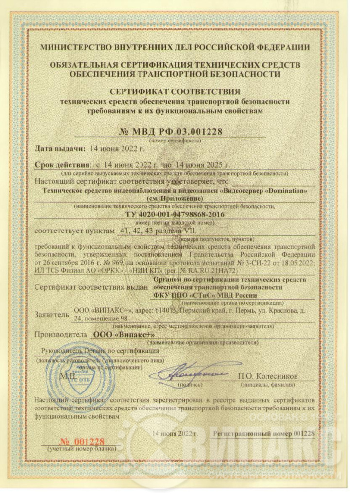 — встроенное программное обеспечение «Domination» (ПО зарегистрировано согласно ПП РФ 1236 Реестровая запись №1786 от 06.09.2016);